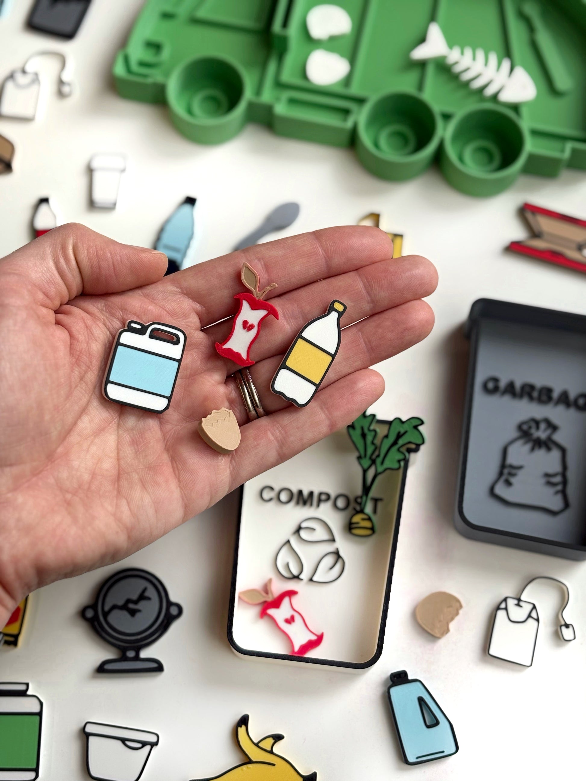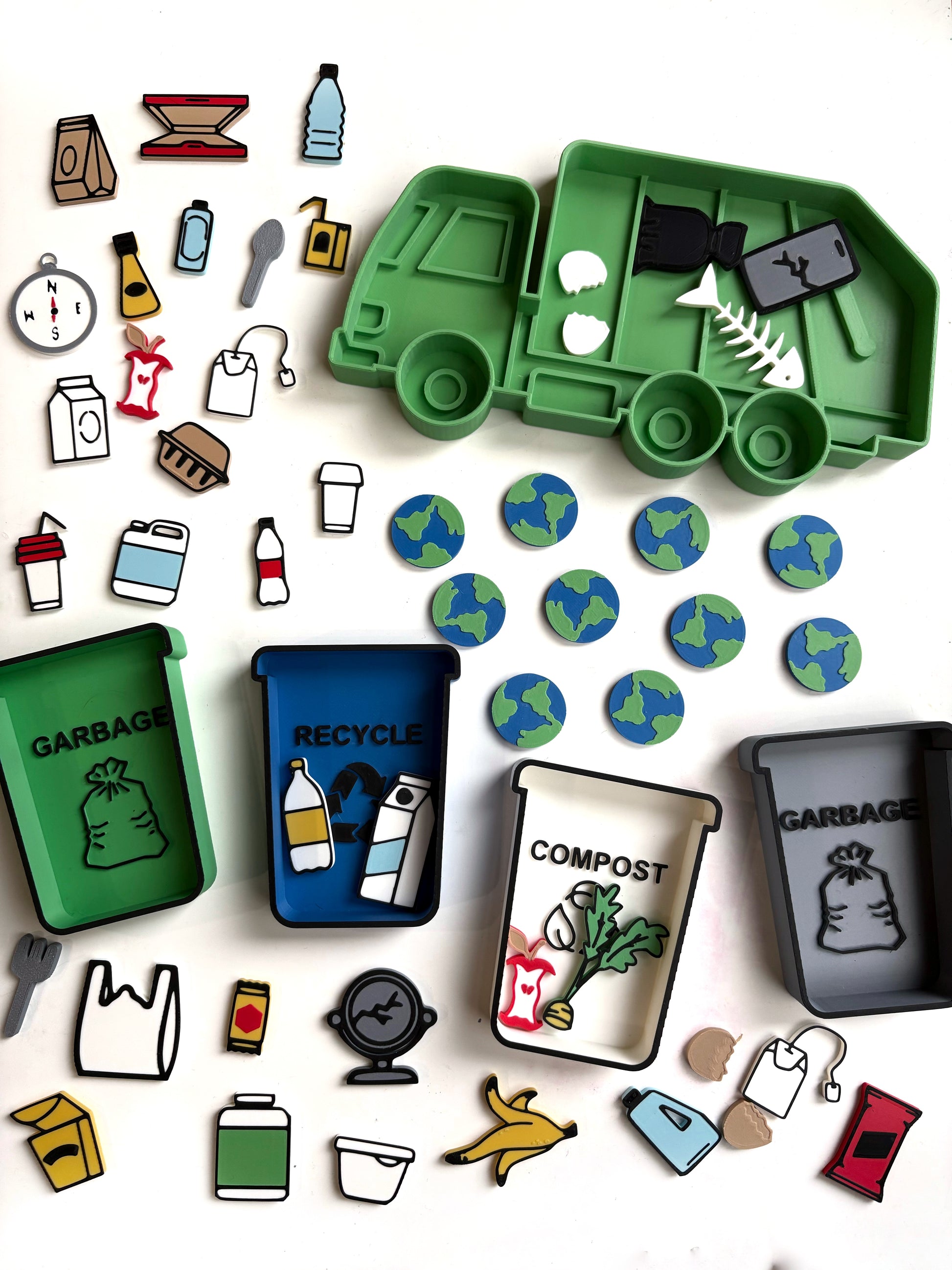 Help little hands learn how to care for the Earth through hands-on sorting and sensory exploration. This interactive set includes three trays — compost, recycling, and garbage — along with assorted filler pieces that children sort into the correct “waste stream.” It’s a simple, engaging way to introduce environmental awareness, sustainability, and everyday responsibility through tactile learning.